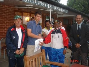 Matt Clarke receives Newdigate Man of the Match from Mahesh Hatkar and Yogesh Kaudare.