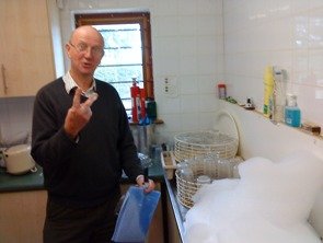 Poor, poor Mr Brown – is he upset that the season has ended ? Has someone slipped behind the bar without telling him ? No, Nick Crawford ‘distracted’ him and the suds escaped from the sink and spread all across the floor. This is his reaction to Nick’s uncontrolled laughter.